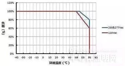 如圖 1 所示,紅色曲線表示 LED 驅(qū)動器在輸入 120Vac 情況下,其負載隨環(huán)境溫度變化的功率降額曲線。當環(huán)境溫度低于 50℃ 時,驅(qū)動器允許 100% 滿載,當環(huán)境溫度高達 70℃ 時,驅(qū)動器只能降額到 60% 的負載,當環(huán)境溫度在 50-70℃ 之間變化時,驅(qū)動器負載隨溫度上升而線性下降。