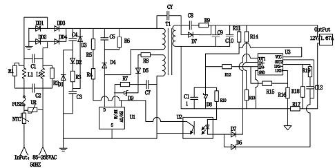 電源的核心部分采用反激式變換器,結構簡單,易于實現(xiàn)。整體設計電路圖如圖1。