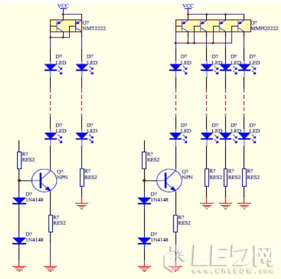 下圖采用集成三極管可以保持每路LED電流一致,這些三極管在相同溫度環(huán)境下、相同工藝條件生產(chǎn)出來的β值一樣,可以保證每路電流基本一樣。恒流部分在要求不是很高的條件下可以這樣設(shè)計,穩(wěn)定的電壓或穩(wěn)定的PWM伏值驅(qū)動穩(wěn)壓后的三極管偏壓,做到基本恒流。