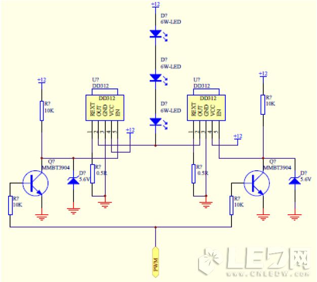 下圖采用DD312并聯(lián)參考設(shè)計直接驅(qū)動3顆6W LED。使能PWM控制信號需要適當(dāng)?shù)母綦x,避免相互干擾和驅(qū)動能力問題。EN使能電壓要符合規(guī)格書要求,不要電壓太高損壞EN腳。一般IC耐壓是指負載和電源,沒有注明激勵電壓請不要大于5V設(shè)計。