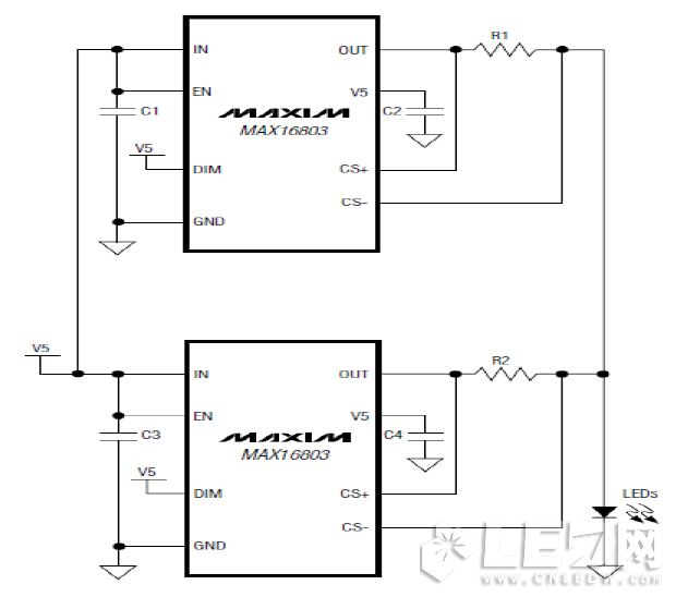 像這種檢測在LED的一端LED恒流驅(qū)動IC也可以并聯(lián)設(shè)計驅(qū)動,實際上IC是單獨工作的,最后在并流一起。DC-DC方式是工作在較高的頻率上,需要注意的是PCB布板時避免交叉設(shè)計,各自濾波、旁路電容要緊靠IC附近,負載電流最后會和即可。