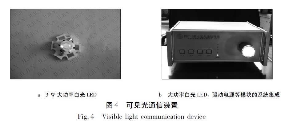 為測試所制作的雙DC /DC 并聯(lián)供電系統(tǒng)的性能,采用3 W 大功率白光LED( 額定電流750 mA、額定電壓4. 0 V) 做了驅(qū)動實驗與性能測試,LED 的照片如圖4 所示。將大功率白光并聯(lián)供電系統(tǒng)、大功率白光LED、數(shù)據(jù)編碼模塊、Bias-Tee 耦合模塊以及按鍵/指示燈等進行了系統(tǒng)集成,研制了兼具照明與通信雙重功能的通信裝置( 見圖4b) .利用該裝置,對給出的并聯(lián)供電系統(tǒng)進行了實驗。