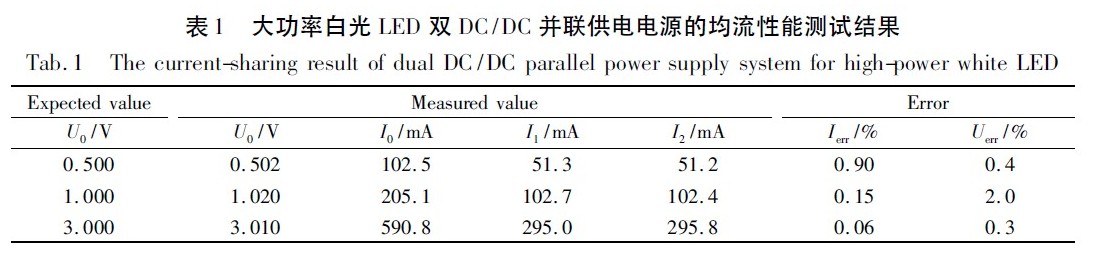 由表1 可見,測得的實際電壓與設(shè)定值相比,3 次測量的誤差小于2%,兩支路電流的偏差小于1%,實現(xiàn)了很好的穩(wěn)壓與均流效果。