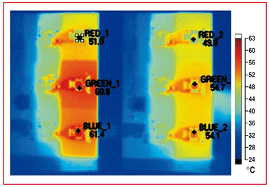 散熱圖在高功耗 LED 的性能中,工作溫度是一個(gè)重要的參數(shù),其會(huì)給工作壽命、正向電壓、輸出波長(zhǎng)甚至是設(shè)備的亮度帶來(lái)很大影 響。LED 的工作溫度越高,其預(yù)期壽命就越短??紤]到這一因素,我們選擇的實(shí)驗(yàn)印刷電路板尺寸,要能夠允許將 SK477100 型散熱 片(由 Fischer ELektronik 制造)安裝到使用雙面粘合熱傳輸材料的電路板背面。在滿功率下運(yùn)行時(shí),這可以將 LED 的溫度從 61 °C(無(wú) 散熱片)降低至 54 °C(有散熱片)。該散熱片還有助于加速印刷電路板區(qū)域上的熱量耗散。為了制作一幅示例散熱圖,我們將電路板和 Cree 公司的 LED 組裝在一起。圖 6 生動(dòng)地顯示了結(jié)果,從而描述出了無(wú)散熱片(圖 左側(cè))和有散熱片(圖右側(cè))時(shí) LED 的溫度情況。