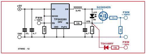 利用 PWM 進(jìn)行調(diào)光作為一個(gè)示例,我們將會(huì)看到一些使用 TPS62260 實(shí)施 PWM 控制的方法。TPS62260 是一款同步降壓轉(zhuǎn)換器,其具有集成的開(kāi)關(guān) 元件,典型的時(shí)鐘頻率為 2.25MHz。在圖 2 的電路中,我們以黑色顯示了將 PWM 信號(hào)直接連接至 EN(使能)引腳的可能性。整個(gè)開(kāi) 關(guān)調(diào)節(jié)器電路和 PWM 信號(hào)一起開(kāi)啟和關(guān)閉。在我們實(shí)驗(yàn)中的試驗(yàn)表明,在這種配置中,我們可以使用一個(gè)高達(dá) 100Hz 的 PWM 頻 率。這種排列的優(yōu)點(diǎn)是其簡(jiǎn)易性:不需要額外的組件。另外,它還是最為高效能的實(shí)施方法,因?yàn)樵撻_(kāi)關(guān)調(diào)節(jié)器在關(guān)閉時(shí)僅產(chǎn)生非 常少的靜態(tài)電流。其缺點(diǎn)是,LED 對(duì)使能引腳上高電平的反應(yīng)被延遲。這是因?yàn)殚_(kāi)關(guān)調(diào)節(jié)器具有一種“軟啟動(dòng)”功能:當(dāng)器件被開(kāi)啟時(shí) ,輸出電流逐漸上升,直到其達(dá)到額定的 LED 電流。在一些應(yīng)用中,這種上升斜坡可能會(huì)存在一些問(wèn)題,因?yàn)?LED 發(fā)光的波長(zhǎng)隨電 流從其最小值到正常工作電平的逐漸增強(qiáng)而變化。例如,在一個(gè) DLP 投影儀或 LCD 電視面板的 LED 背光燈中,這種變化可能是我 們無(wú)法接受的。但是,就這個(gè)示范項(xiàng)目而言,肉眼無(wú)法看到這種影響。在第二個(gè)變量中(圖 2 中紅色所示部分),PWM 信號(hào)通過(guò)一個(gè)小信號(hào)二極管被耦合至 TPS62260 的誤差放大器輸入端。在本電路 中,一個(gè)施加于控制輸入端的超過(guò) 600mV 的正電壓會(huì)使誤差放大器輸入驅(qū)動(dòng)過(guò)度,并由此關(guān)閉 LED。由于這個(gè)電路沒(méi)有使用使能 輸入,因此它不具有與調(diào)節(jié)器軟啟動(dòng)功能相關(guān)的啟動(dòng)延遲,且 LED 被極為快速地開(kāi)啟和關(guān)閉。因此,上述電流斜坡所帶來(lái)的輸出波長(zhǎng)變化在本結(jié)構(gòu)中小到可以被忽略不計(jì)。另外,我們?cè)趯?shí)驗(yàn)室里發(fā)現(xiàn),PWM 頻率可以上升 到 5kHz。圖 2 中藍(lán)色部分顯示了第三種可能性。這里的 PWM 信號(hào)被用于控制線連至 LED 的 MOSFET。MOSFET 使 LED 短路,并允許其 被更加快速地開(kāi)啟和關(guān)閉。該調(diào)節(jié)器運(yùn)行在恒定電流模式中,而且電流將會(huì)流經(jīng) LED 或者 MOSFET。這種方法的一些缺點(diǎn)包括 MOSFET 帶來(lái)的額外成本以及低效能:在 2Ω 電流感應(yīng)電阻器中會(huì)有高達(dá) 180mW 的功率被不斷耗散掉。其優(yōu)點(diǎn)是較高的開(kāi)關(guān)頻率: 在一些實(shí)驗(yàn)中,我們看到 TPS62260 可以成功運(yùn)行在 50kHz PWM 頻率的狀態(tài)下。