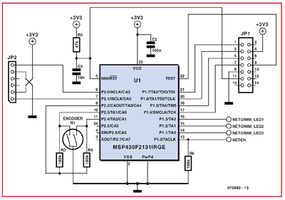 圖 3 使用 JTAG 連接 (JP1)、eZ430 連接器 (JP2) 和旋轉(zhuǎn)編碼器 (R1) 基于 MSP430 微控制器的這種電路的控制部分