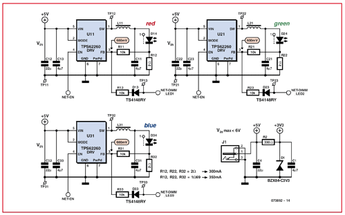 圖 4 由三個(gè)配置為恒定電流源的開(kāi)關(guān)調(diào)節(jié)器和一個(gè)使用分立組件構(gòu)建的 3.3V 穩(wěn)定電源組成的電路部分實(shí)際電路
