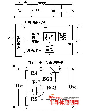 在直流LED凈化燈開關(guān)電源電路中,為了保護(hù)調(diào)整管在電路短路、電流增大時(shí)不被燒毀。其基本方法是,當(dāng)輸出電流超過某一值時(shí),調(diào)整管處于反向偏置狀態(tài),從而截止,自動(dòng)切斷電路電流。如圖1所示,過電流保護(hù)電路由三極管BG2 和分壓電阻R4、R5組成。電路正常工作時(shí),通過R4與R5的壓作用,使得BG2 的基極電位比發(fā)射極電位高,發(fā)射結(jié)承受反向電壓。于是BG2 處于截止?fàn)顟B(tài)(相當(dāng)于開路),對(duì)穩(wěn)壓電路沒有影響。當(dāng)電路短路時(shí),輸出電壓為零,BG2 的發(fā)射極相當(dāng)于接地,則BG2 處于飽和導(dǎo)通狀態(tài)(相當(dāng)于短路),從而使調(diào)整管BG1 基極和發(fā)射極近于短路,而處于截止?fàn)顟B(tài),切斷電路電流,從而達(dá)到保護(hù)目的。